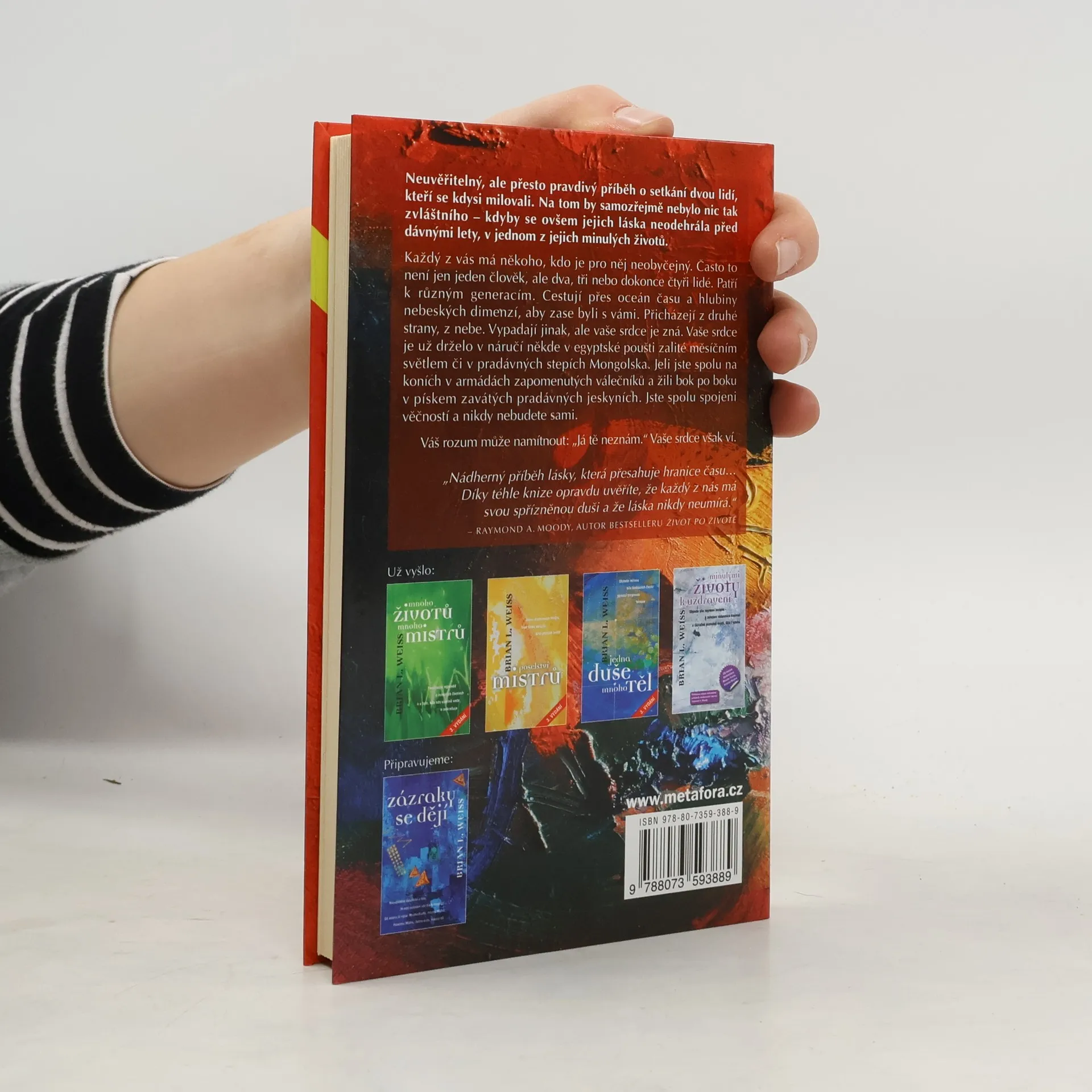 Ve filmech, v románech, ale i v životě si lidé občas slibují lásku „dokud nás smrt nerozdělí“. Jenže co když je smrt jen další branou, dveřmi otevřenými k novým zrozením a novým setkáním se svými milovanými? Dr. Weiss je nezvratně přesvědčen, že tomu tak opravdu je. Proč? Do jeho ordinace, kde pomáhá lidem metodou regresní terapie, přišla mladá žena Elizabeth. Po matčině smrti trpěla nesmírným zármutkem, měla problémy i se vztahy k mužům. Dr. Weiss ji zavedl do minulých životů, aby se společně pokusili odhalit příčinu. Ve stejné době se u něj léčil Pedro, sympatický Mexičan, který se také utápěl v žalu. Elizabeth s Pedrem se neznali, takže nikdo netušil, jak neuvěřitelné drama se začíná rozehrávat. Čím hlouběji se totiž nořili do minulosti, tím jasnější se zdálo, že se kdysi velice dobře znali, a co víc, že se milovali! Na lékaři teď bylo těžké rozhodnutí. Má bývalým milencům prozradit pravdu o jejich minulých životech? Má právo zasáhnout do toho současného? Neuvěřitelné svědectví o tom, že naši milovaní nás nikdy neopustí… Od autora již vyšlo: Mnoho životů, mnoho Mistrů, Poselství Mistrů, Jedna duše, mnoho těl