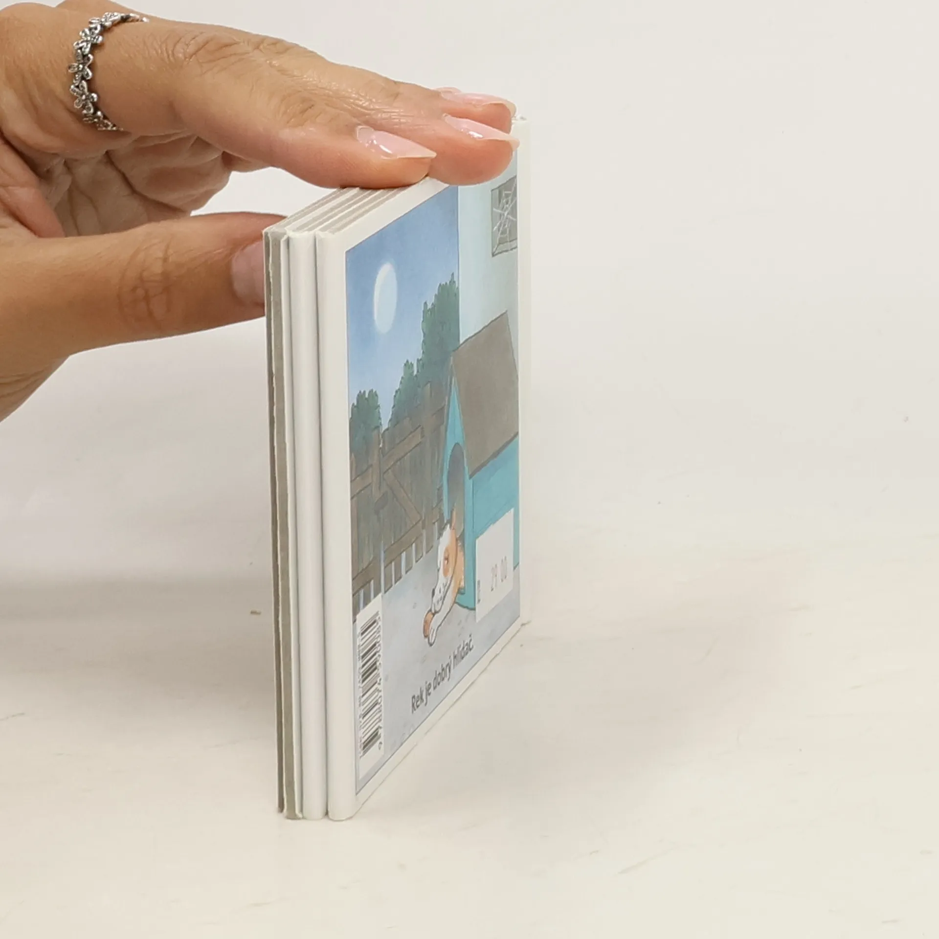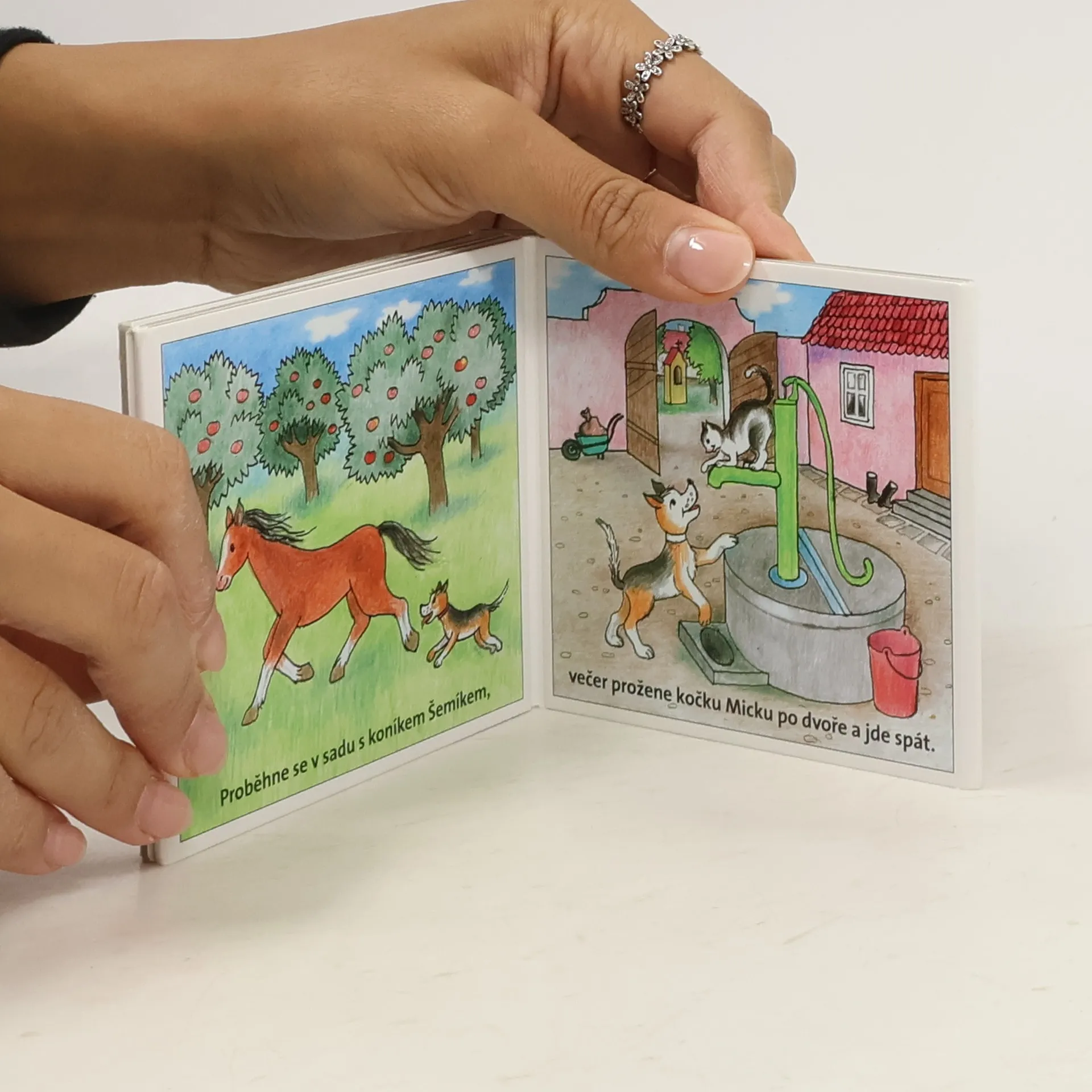 Klasické dětské rozkládací leporelo z pevného kartónu. Jednoduché říkanky o pejskovi a jeho setkání se zvířátky na dvorku.