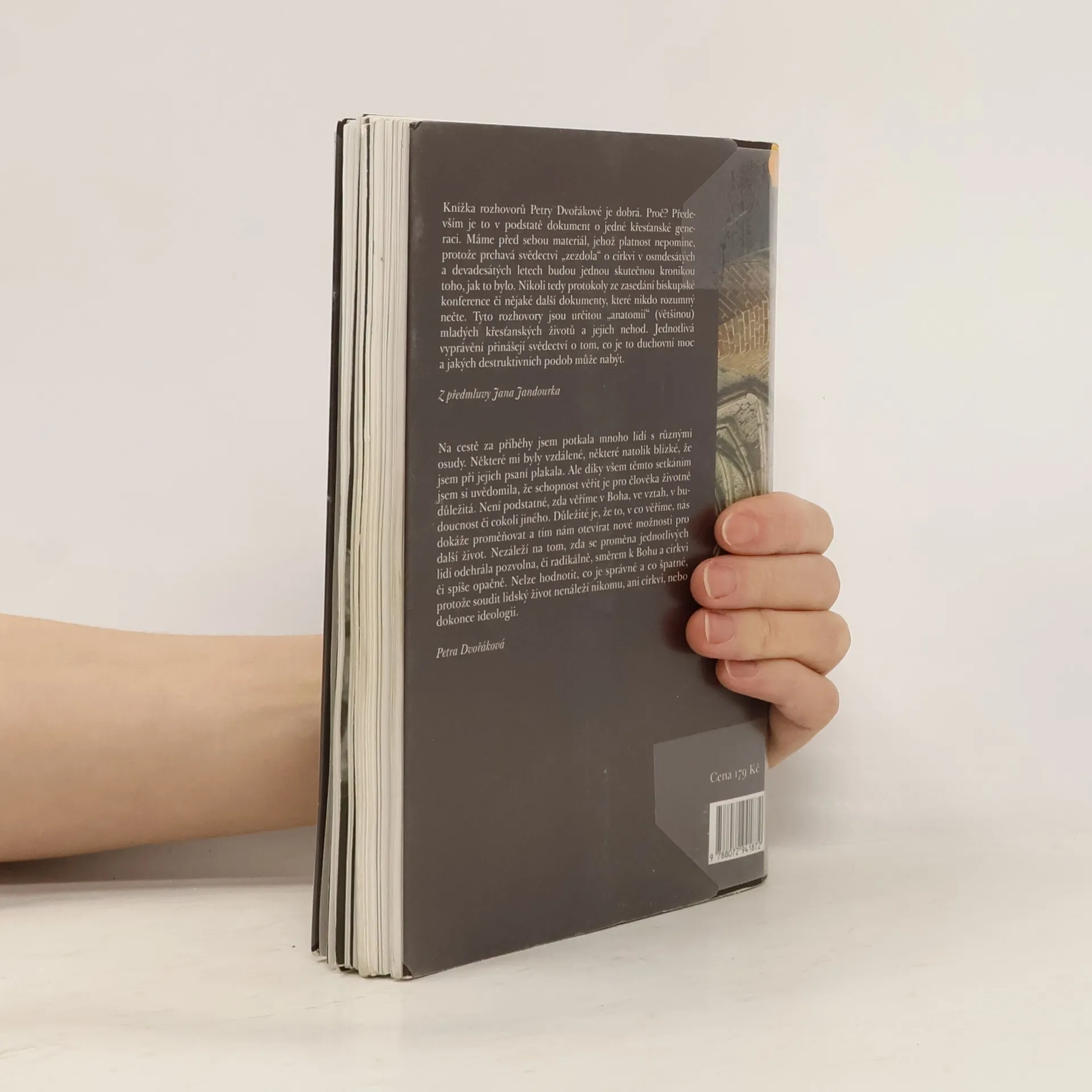 Máme před sebou materiál, jehož platnost nepomine, protože prchavá svědectví „zezdola“ o církvi v osmdesátých a devadesátých letech budou jednou skutečnou kronikou toho, jak to bylo. Nikoli tedy protokoly ze zasedání biskupské konference či nějaké další dokumenty, které nikdo rozumný nečte. Tyto rozhovory jsou určitou „anatomií“ (vetšinou) mladých křesťanských životů a jejich nehod. Jednotlivá vyprávění přinášejí svědectví o tom, co je to duchovní moc a jakých destruktivních podob může nabýt. JAN JANDOUREK Díky všem těmto setkáním jsem si uvědomila, že schopnost věřit je pro člověka životně důležitá. Není podstatné, zda věříme v Boha, ve vztah, v budoucnost či cokoli jiného. Důležité je, že to, v co věříme, nás dokáže proměňovat a tím nám otevírat nové možnosti pro další život. Nezáleží na tom, zda se proměna jednotlivých lidí odehrála pozvolna nebo radikálně, směrem k Bohu a církvi, či spíše opačně. Nelze hodnotit, co je správné a co špatné, protože soudit lidský život nenáleží nikomu, ani církvi, nebo dokonce ideologii. PETRA DVOŘÁKOVÁ