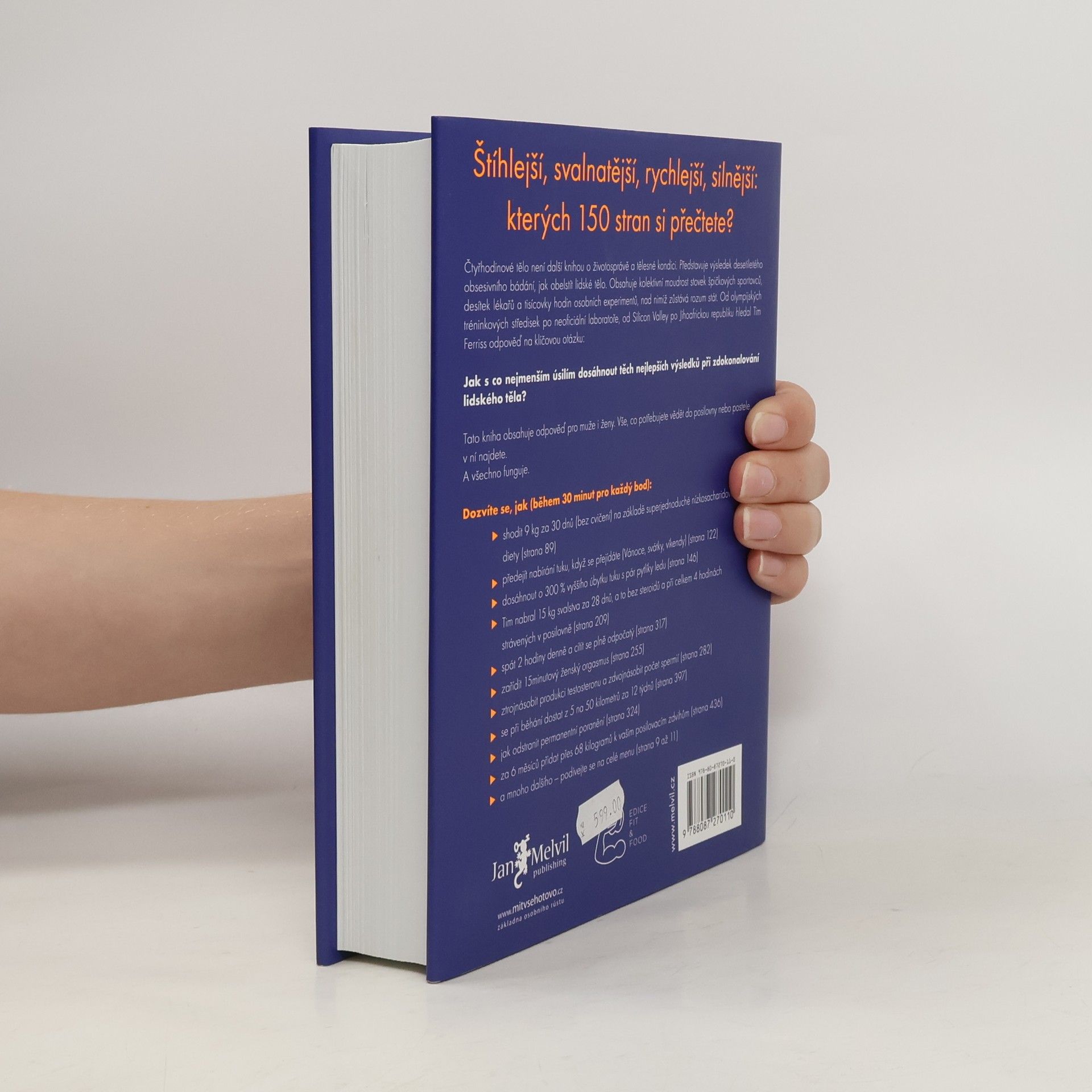 Neobvyklá cesta ke zhubnutí, zlepšení sexu a proměně v superčlověka. Pokud znáte Ferrissův úspěšný a kontroverzní "Čtyřhodinový pracovní týden", víte, že jeho nový bestseller se nebojí šlápnout do uznávaných metod hubnutí a tělesné práce na sobě. Ferriss přiznává, že většina z nás nemá dostatečnou vůli na každodenní sport a dlouhé měsíce odříkání. Nabízí propracované tipy a triky, jak dosáhnout zlepšení s menším úsilím. V knize se dozvíte, jak ženě pomoci k silnému orgasmu, zlepšit spánek či spát méně a být svěží. Ferriss vše testuje na sobě, měří výsledky a nebojí se je s námi sdílet. Tento exkluzivní návod vám prozradí: * Jak shodit 9 kg za 30 dnů (bez cvičení) na základě jednoduché nízkosacharidové diety * Jak předejít nabírání tuku během svátků * Jak dosáhnout o 300 % vyššího úbytku tuku s pár pytlíky ledu * Jak nabrat 15,5 kg svalstva za 28 dnů bez steroidů * Jak spát 2 hodiny denně a cítit se odpočatý * Jak zařídit 15-minutový ženský orgasmus * Jak ztrojnásobit testosteron a užít si sex jako pornohvězda * Jak se dostat z 5 na 50 kilometrů za 12 týdnů * Jak zvrátit trvalé následky poranění * Jak přidat přes 68 kilogramů k vašim zdvihům za 6 měsíců * Jak si zaplatit dovolenou na pláži z jedné návštěvy nemocnice.