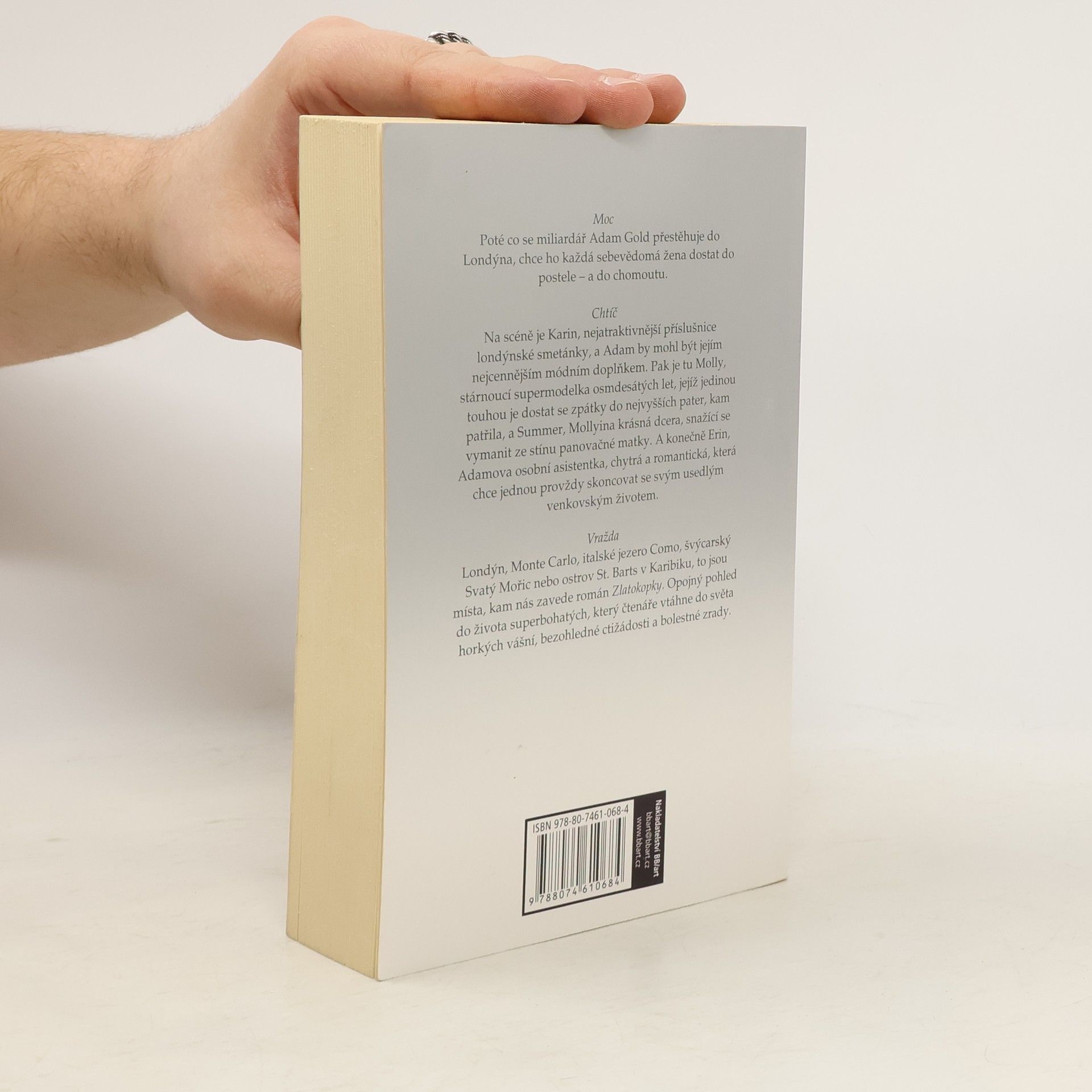 Moc. Poté co se miliardář Adam Gold přestěhuje do Londýna, chce ho každá sebevědomá žena dostat do postele – a do chomoutu. Chtíč. Na scéně je Karin, nejatraktivnější příslušnice londýnské smetánky, a Adam by mohl být jejím nejcennějším módním doplňkem. Pak je tu Molly, stárnoucí supermodelka osmdesátých let, jejíž jedinou touhou je dostat se zpátky do nejvyšších pater, kam patří. Summer, Mollyina krásná mladá dcera, poháněná snahou vymanit ze stínu své panovačné matky, a konečně Erin, Adamova osobní asistentka, chytrá a romantická, která chce jednou provždy skoncovat se svým usedlým venkovským životem. Londýn, Monte Carlo, italské jezero Como, švýcarský Svatý Mořic nebo ostrov St. Barts v Karibiku, to jsou místa, kam nás zavede román Zlatokopky. Opojná cesta do života těch super bohatých, která čtenáře vtáhne do světa horkých vášní, bezohledné ctižádosti a bolestné zrady.