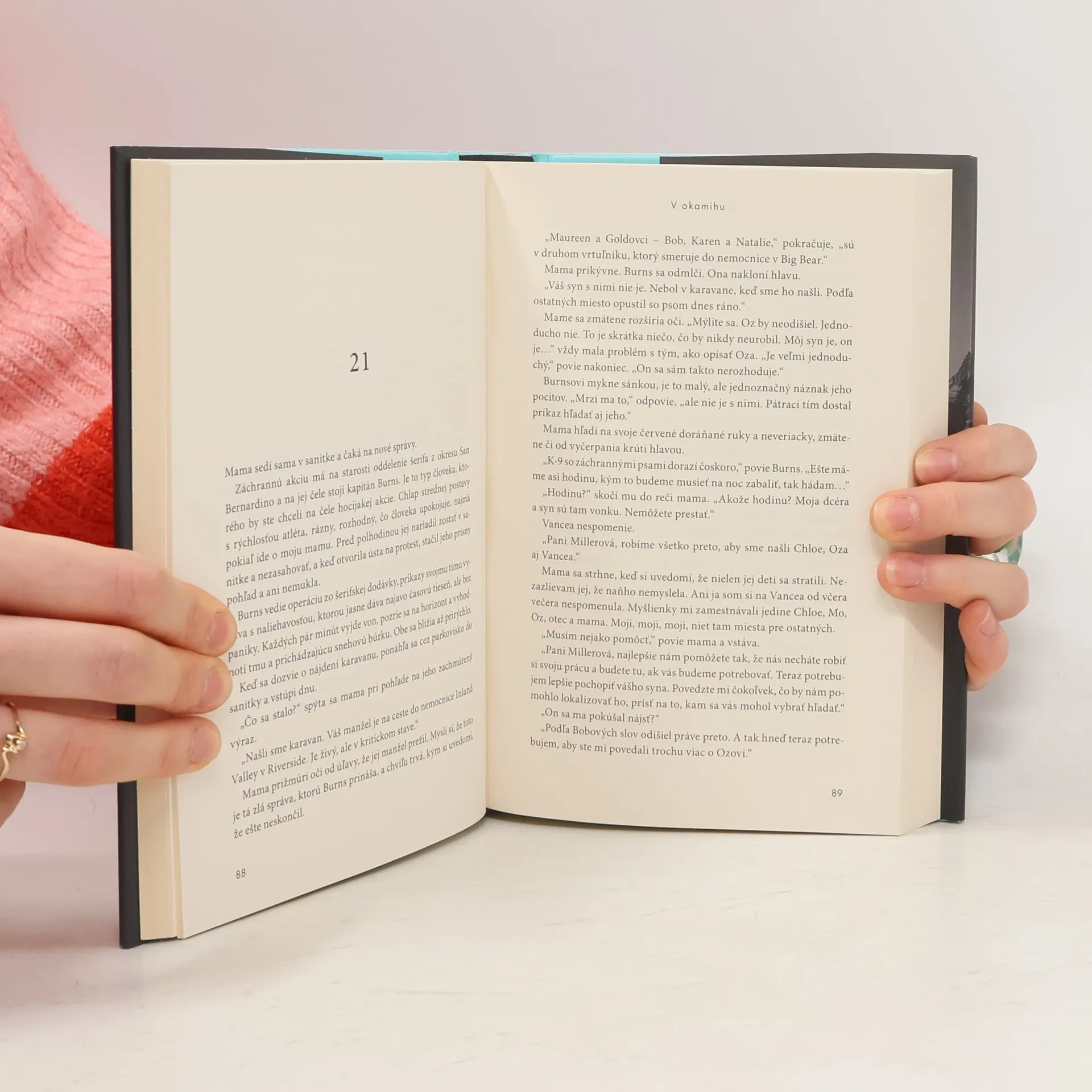 Suzanne Redfearnová si zvolila nezvyčajný spôsob rozprávania – a trafila do čierneho. Šestnásťročná Finn Millerová rozpráva príbeh do najmenších detailov, ako to zvyknú len tínedžeri. Ale Finn už nie je medzi živými. Finn sa s rodinou a najlepšími priateľmi vyberú na chatu. Radostné dobrodružstvo v snehovej metelici sa skončí tragédiou – ľahkomyseľní odvážlivci sa zrútia z útesu. Neľútostný boj o záchranu vtiahne čitateľa do víru emócií zavalených snehovou perinou. Ide o život a odrazu spoznávame nepeknú pravdu o ľudskej povahe. V okamihu je silný a dojímavý príbeh. Upozorňuje nás, že istoty nejestvujú a je potrebné neustále spochybňovať všetko, čo si myslíme o sebe a o ľuďoch, ktorým bezhranične dôverujeme.