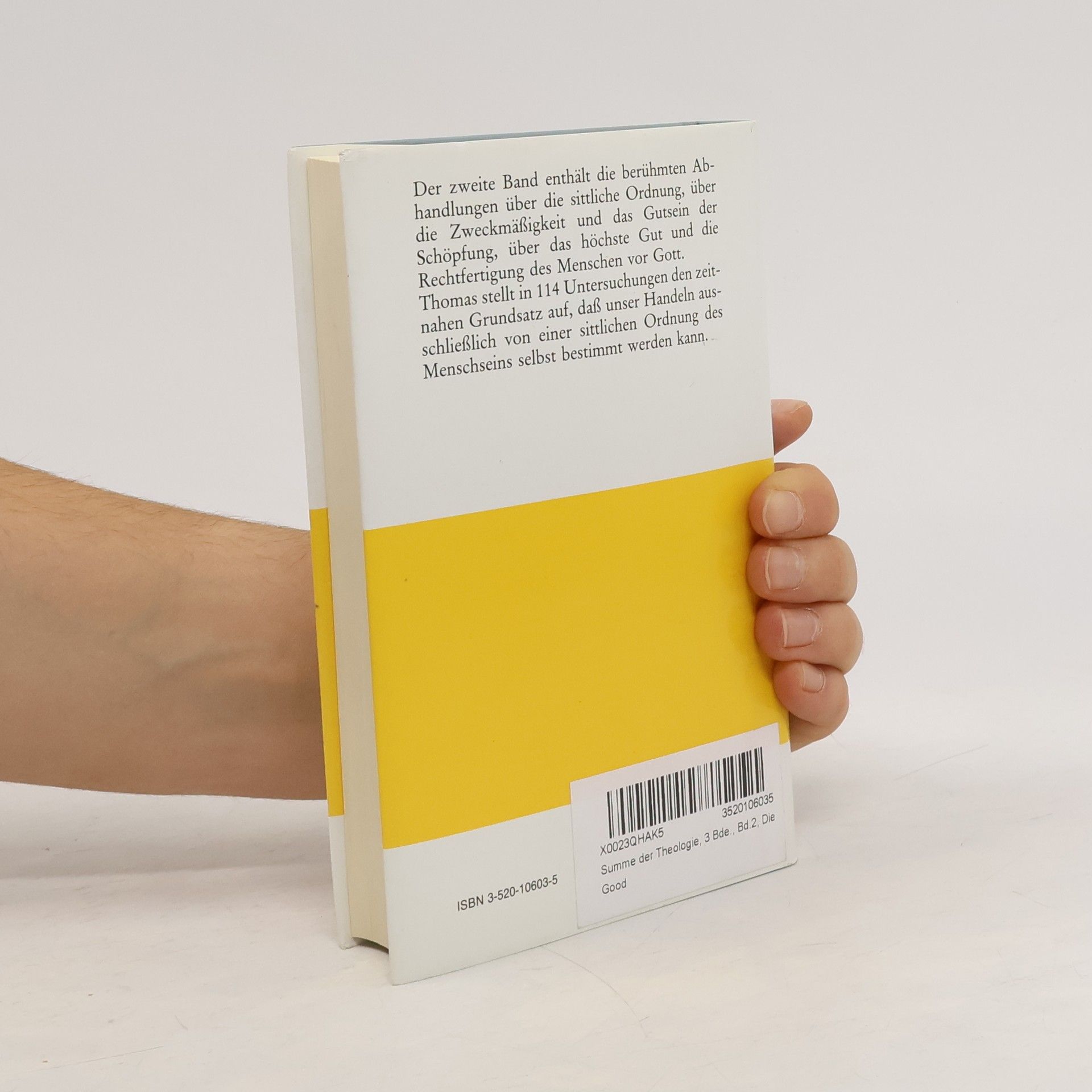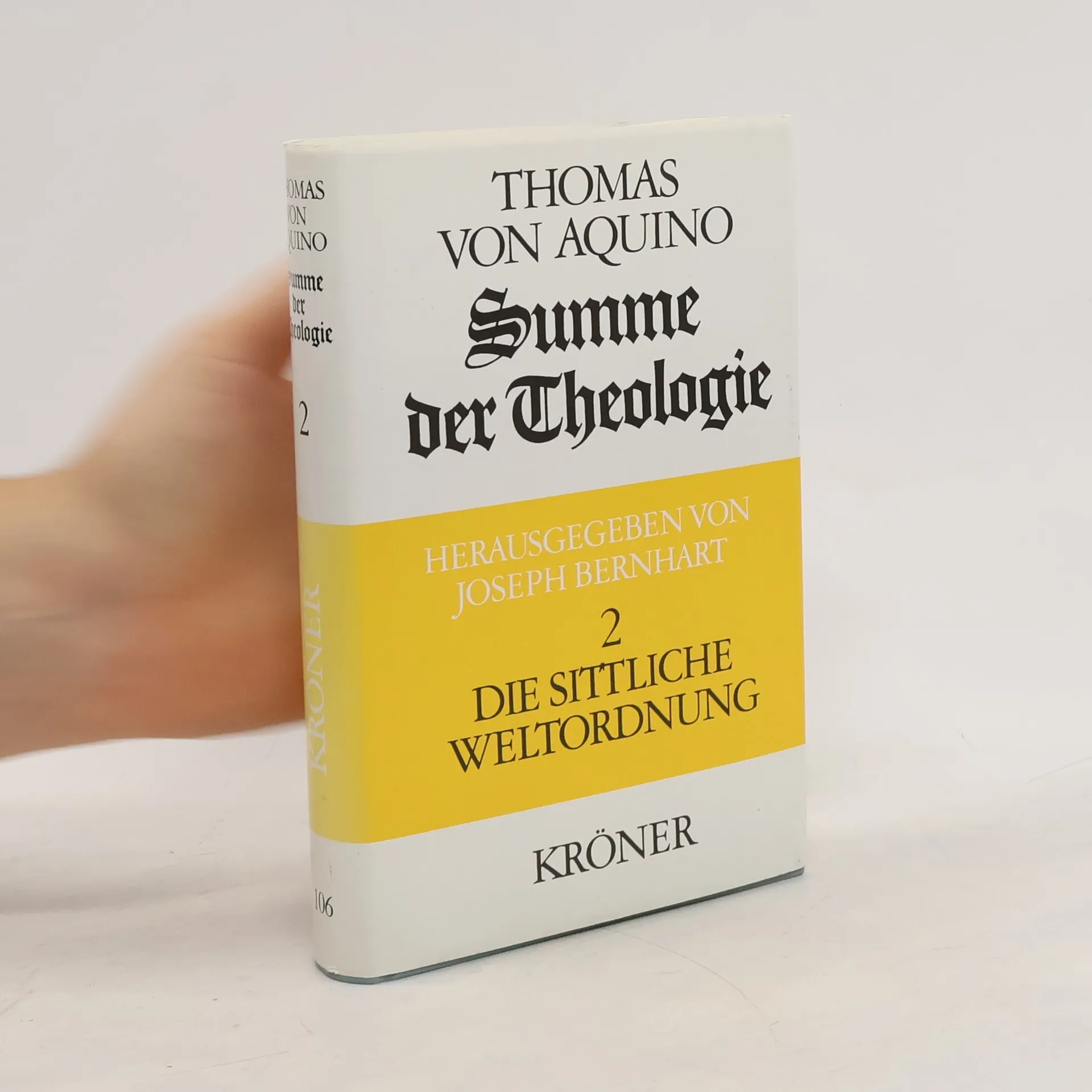 Die von Joseph Bernhart übersetzte 3-bändige Kröner-Ausgabe der ›Summa theologiae‹ bietet eine mit großem Sachverstand zusammengestellte Auswahl mit Einführungen, Zwischenberichten und erläuternden Anmerkungen, einem umfangreichen Glossar und Sachregister. Der zweite Band enthält 114 Abhandlungen über die sittliche Ordnung, über die Zweckmäßigkeit der Schöpfung, das höchste Gut und die Rechtfertigung des Menschen vor Gott.
