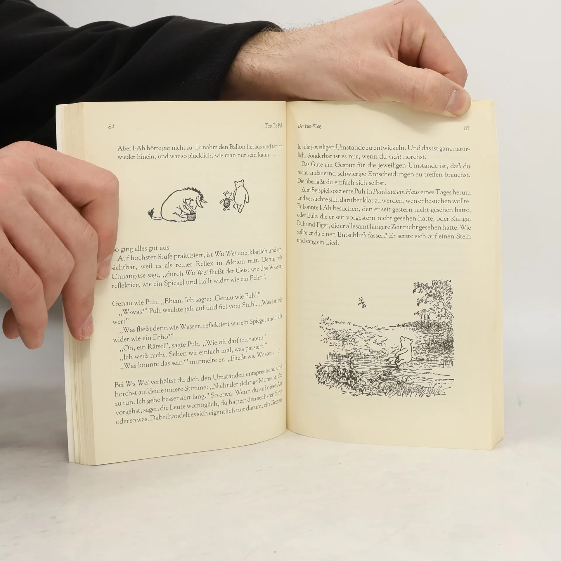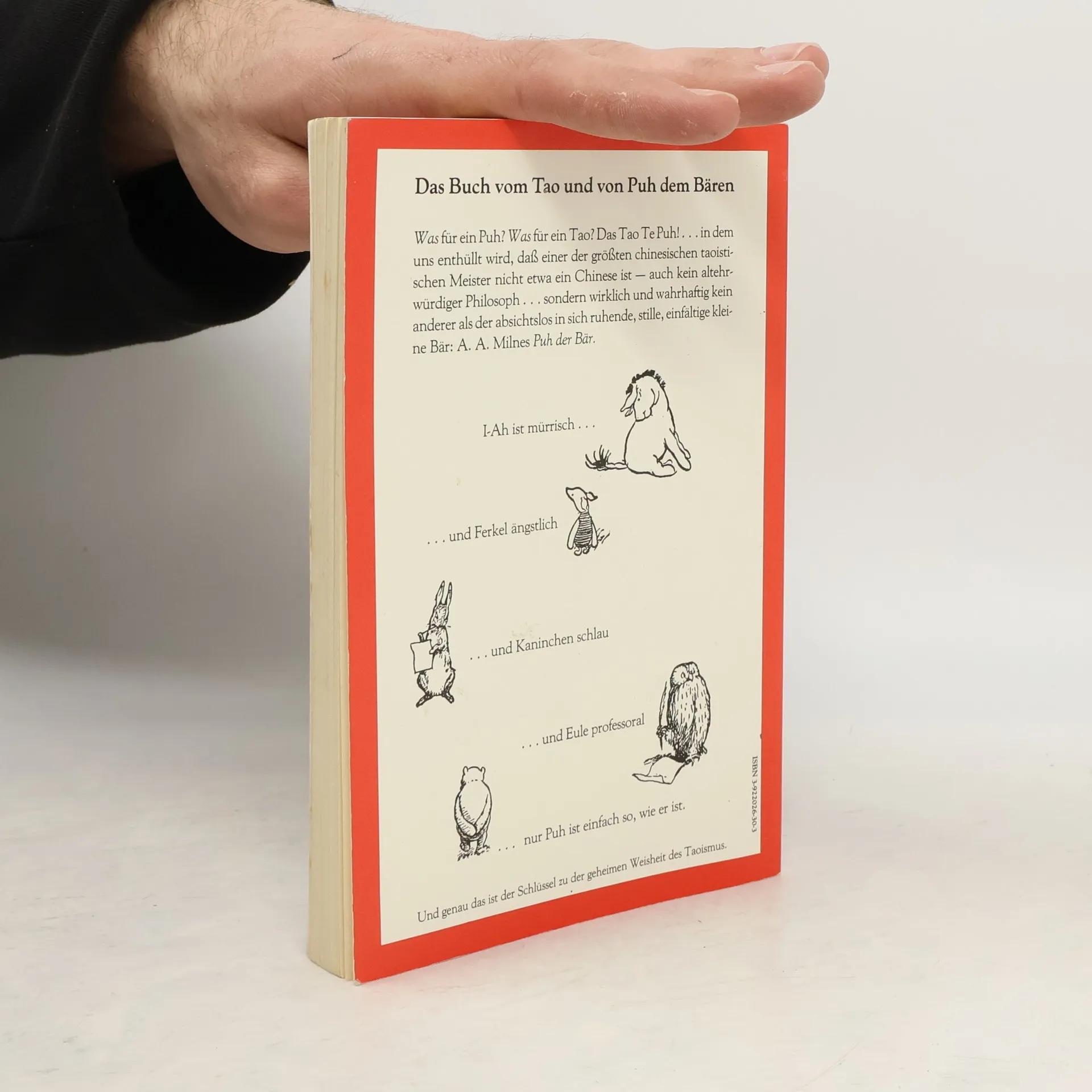 Was für ein Puh? Was für ein Tao? Das Tao Te Puh, in dem uns enthüllt wird, daß einer der größten chinesischen taoistischen Meister nicht etwa ein Chinese ist - auch kein altehrwürdiger Philosoph, sondern wirklich und wahrhaftig kein anderer als der absichtslos in sich ruhende, stille, einfältige kleine Bär. I-Ah ist mürrisch.. ..und Ferkel ängstlich ..und Kaninchen schlau ..und Eule professoral ..nur Puh ist einfach so, wie er ist. Und genau das ist der Schlüssel zu der geheimen Weisheit des Taoismus.